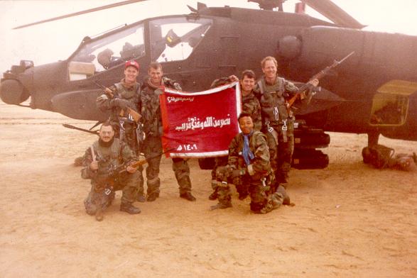 28 Feb 1991 (southern Iraq) with captured weapons and an Iraqi flag.