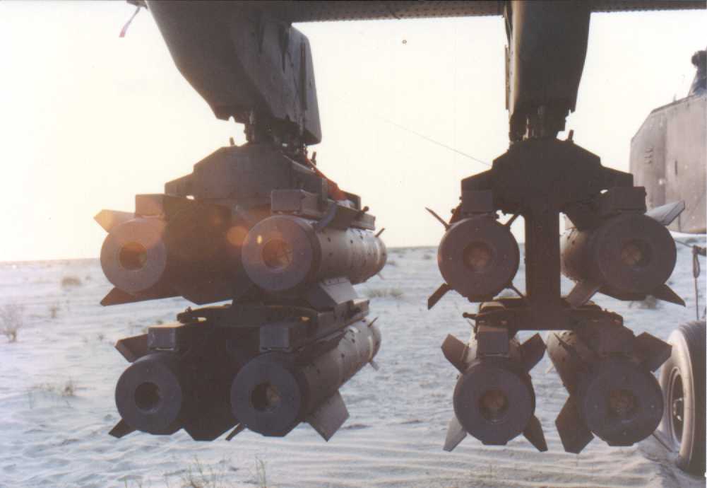 Hellfire missiles hanging off the wing of an AH-64